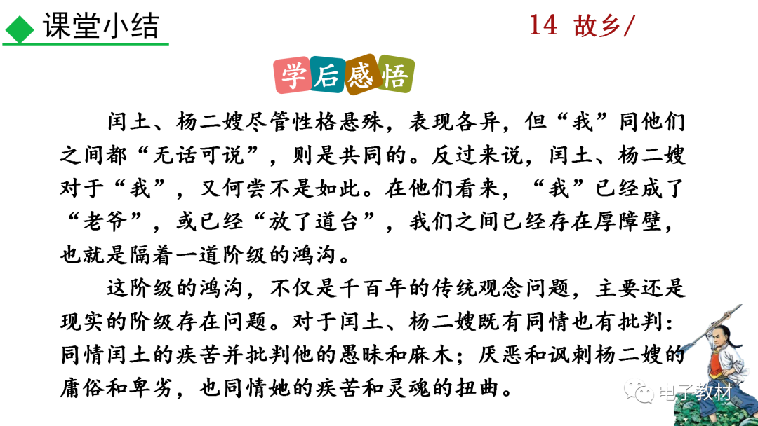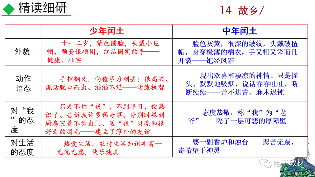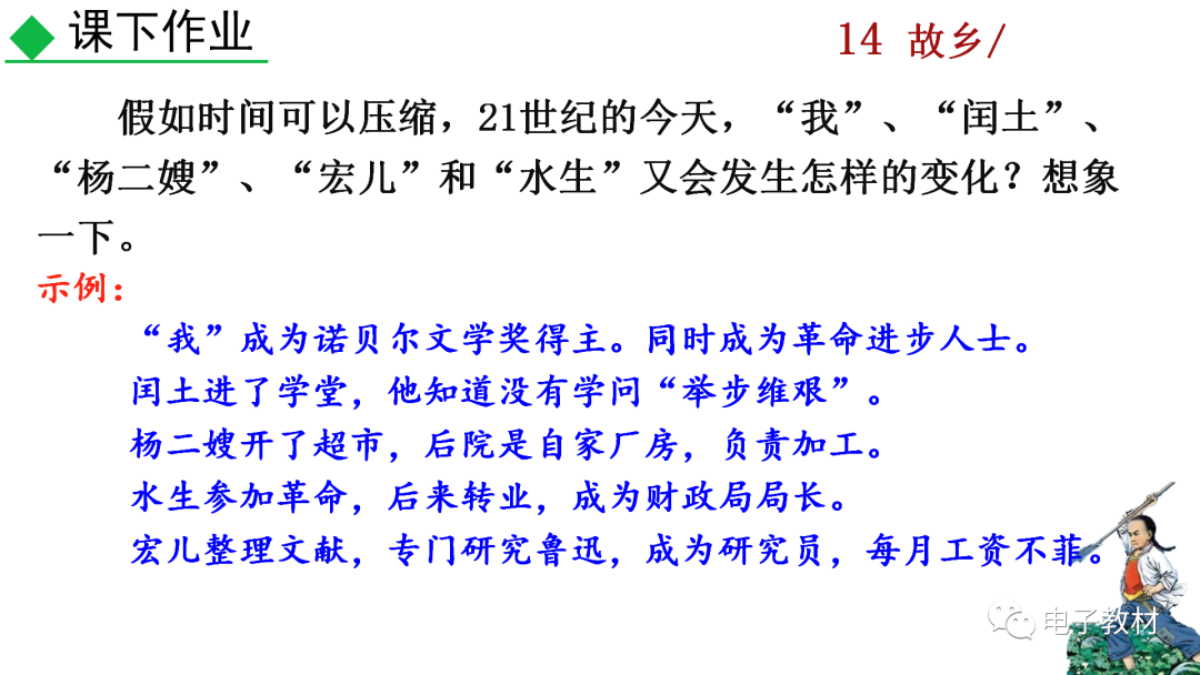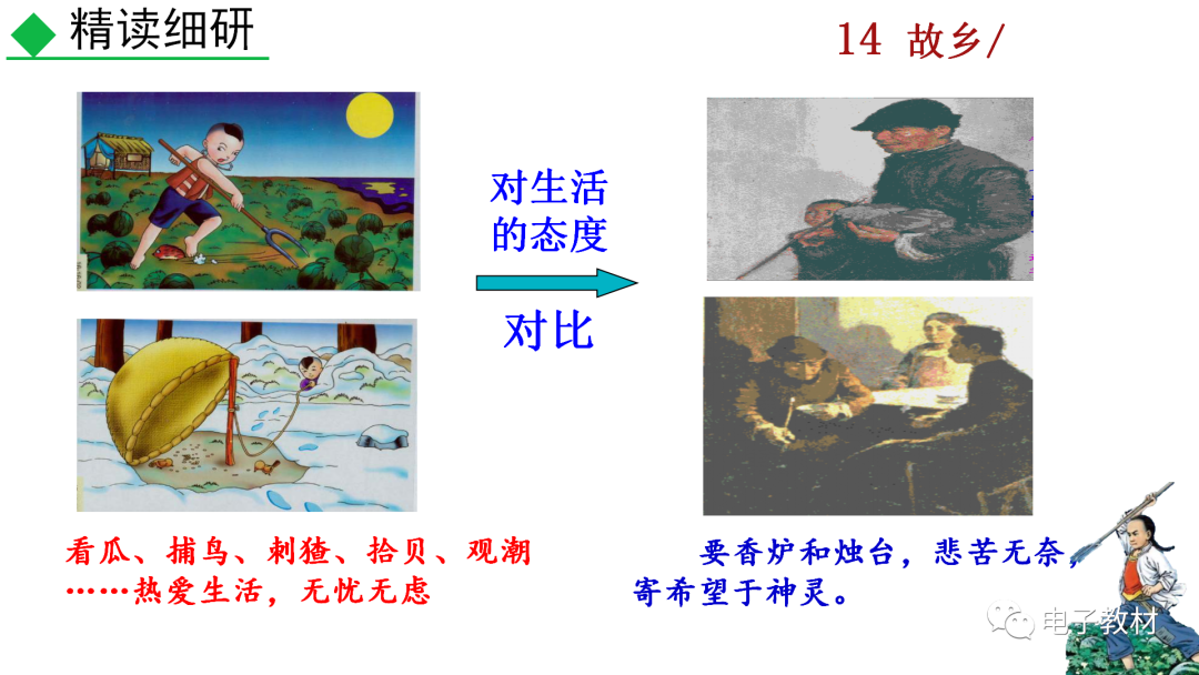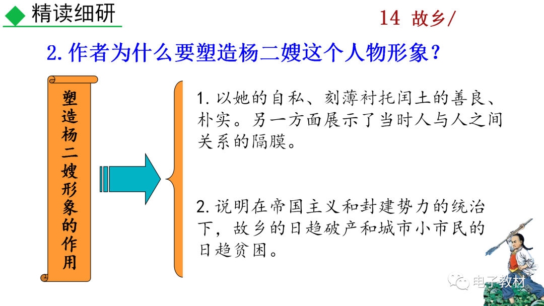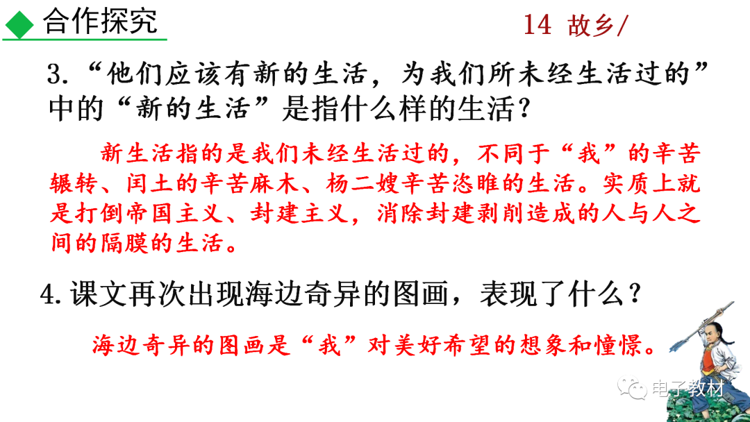 2.这里否定了三种生活,即像“我”那样异地谋生,到 处奔波;像闰土那样在生活的重压下贫闲艰辛,萎靡 麻木;像杨二嫂那样因生活变得尖刻势利。这句话表 达了“我”希望有新的生活。