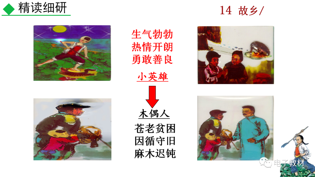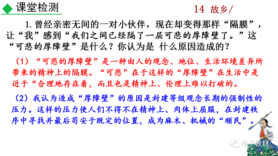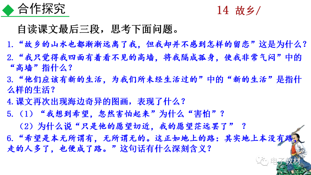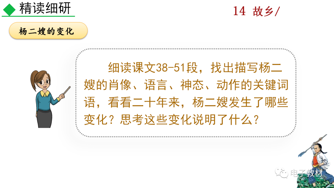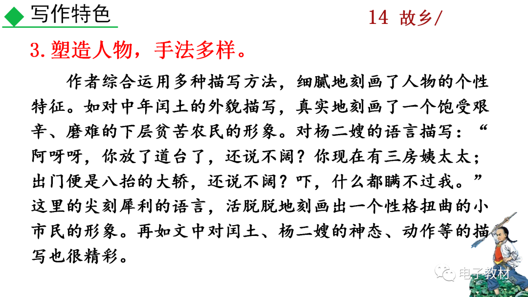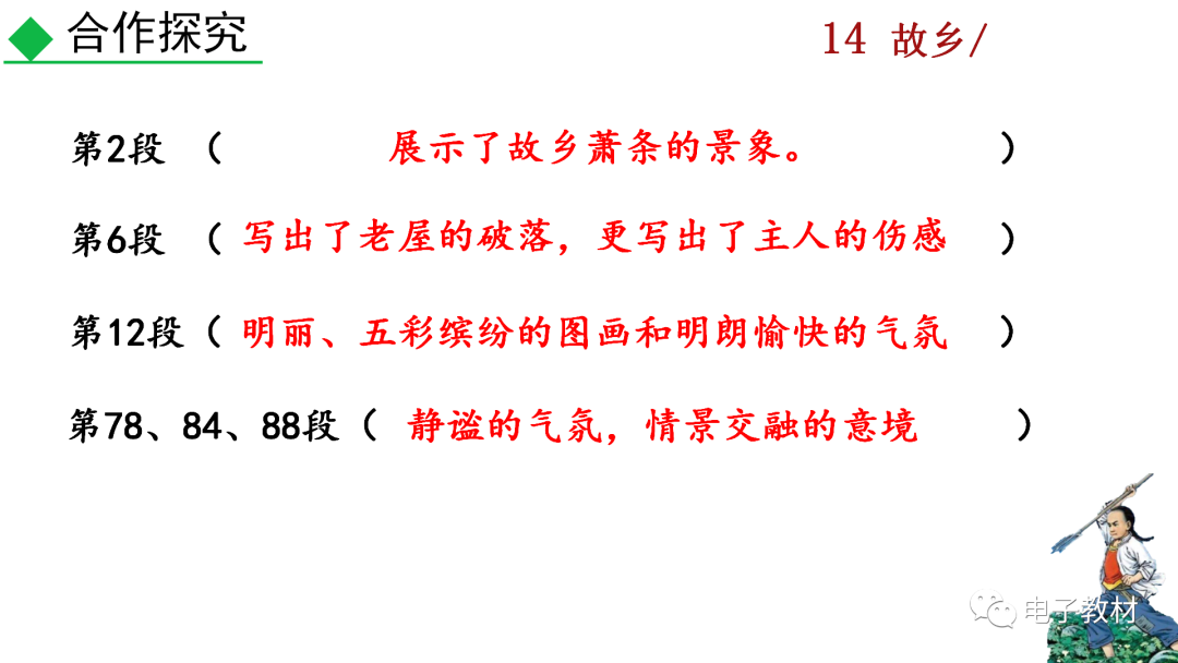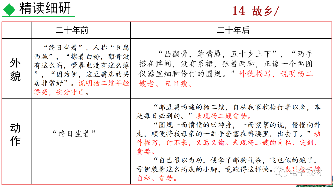 2.这里否定了三种生活,即像“我”那样异地谋生,到 处奔波;像闰土那样在生活的重压下贫闲艰辛,萎靡 麻木;像杨二嫂那样因生活变得尖刻势利。这句话表 达了“我”希望有新的生活。