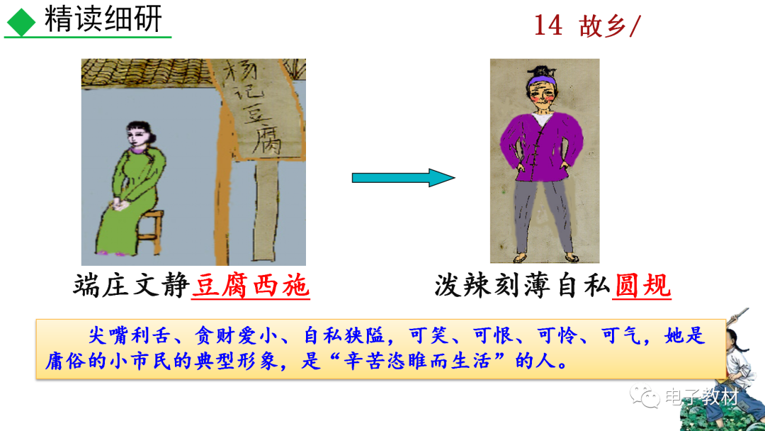 杨二嫂:二十多年前人称“豆腐西施”,“因为伊, 这豆腐店的买卖非常好”。二十年后,她变得刻薄、 贪婪。为了从“我”家捞点东西,不是虚伪地吹捧, 就是尖刻地嘲讽。