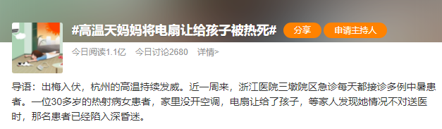 7月13日#高温天妈妈将电扇让给孩子被热死#这一话题冲上热搜这事是不是真的?记者采访了文内提到的浙江医院三墩院区急诊科。急诊科医生说,确有其事,不过是好几年前的事了。当年接诊这位热射病女患者的浙江医院急诊科马霜霜医师说,“这个妈妈30多岁,被送过来的时候已经没有生命体征了,心跳、呼吸都停了。” 马医师回忆起当时的场景,“送来的是她的老公,她是在家带孩子的全职妈妈,老公在外务工。家里条件不是很好,所以热天她也不舍得开空调,就开了电扇让孩子吹。孩子还很小,当时她在家可能已经中暑了,但是家里只有她和孩子两人,等她老公晚上回家才发现她已经倒地不起了。”当时这位妈妈已经陷入深昏迷。问老公怎么会拖这么久才来?她老公解释说“平时她不怕热”。最终,医生们竭尽全力还是无力回天。