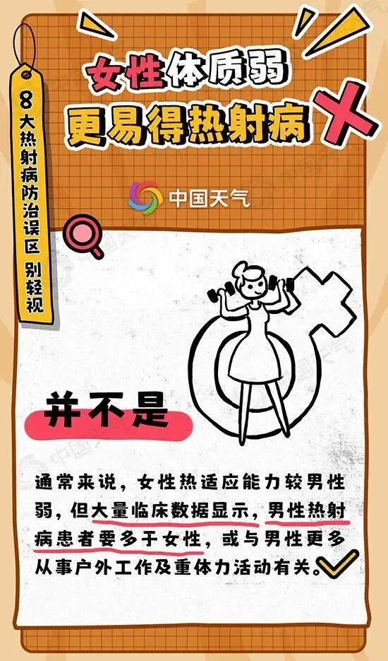 预防热射病最重要的是多喝水,包括白水、盐水、含有钾、钠、氯等电解质的饮料。大量进食冷饮会加重肠胃负担。酒精性饮料和高糖饮料会让身体失去水分,不建议喝。误区八女性体质弱,更易得热射病。并不是。
