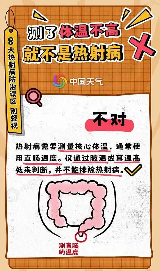 体温升高是热射病的主要特征,患者核心体温多在40℃以上。这里提到的核心温度,常使用直肠温度来反映。我们日常测量的腋温或耳温仅可做参考,不能完全作为诊断热射病的依据。误区六只有夏天才会有热射病。不是。