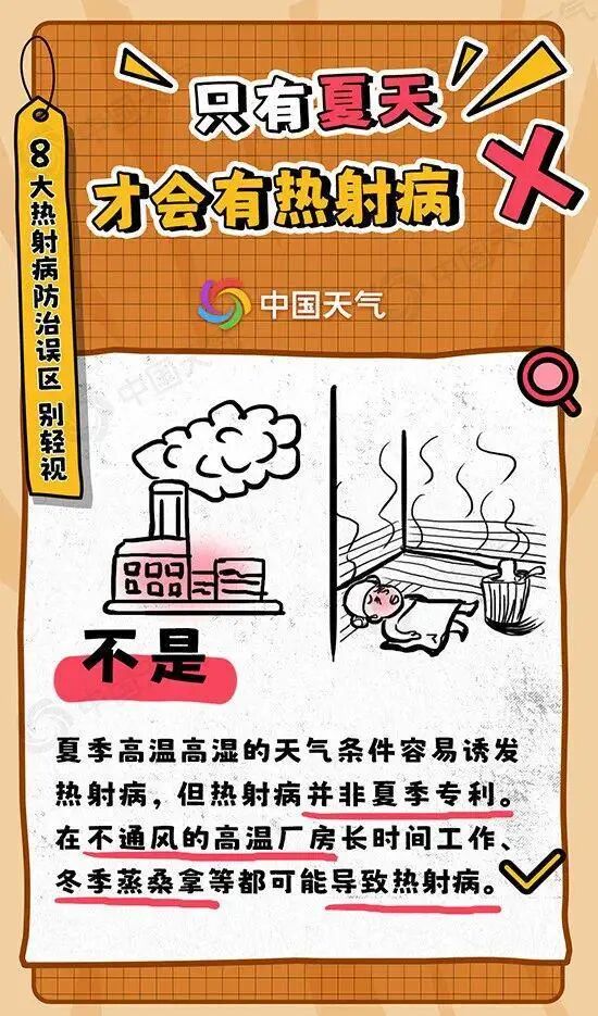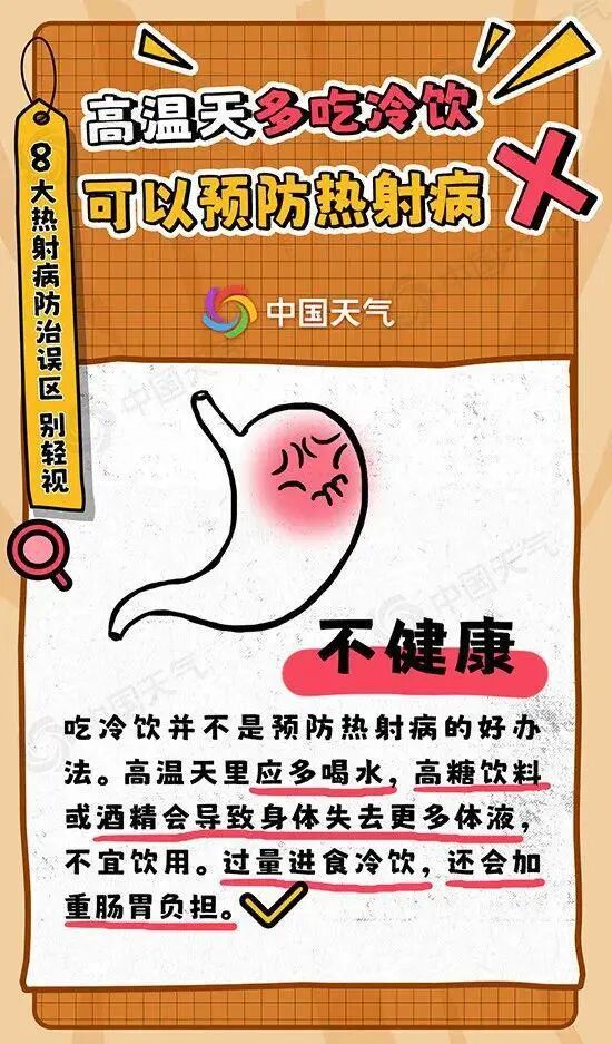 热射病并非夏季专属。如在不通风的高温厂房长时间工作的工人、面对熊熊烈火的消防员,甚至冬季蒸桑拿的人都可能发生热射病。误区七高温天,多吃冷饮可以预防热射病。不健康。