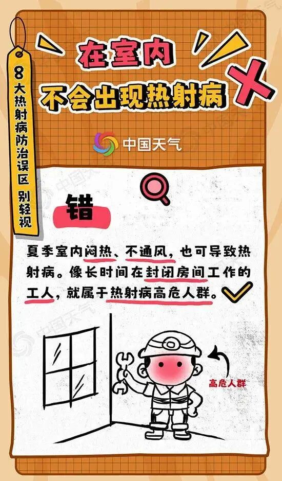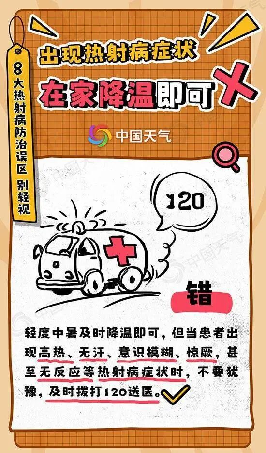中暑一旦发展到了热射病的阶段是极其危险的。当患者出现高热、无汗、意识模糊、惊厥,甚至无反应等热射病症状时,不要犹豫,及时拨打120,尽快送医。误区三在室内,不会出现热射病。错。