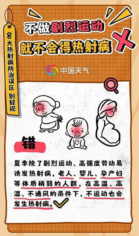 热射病并非室外专属,温度高、通风差的室内小环境也可能引起热射病。像长时间待在封闭空间内的装修工人、车间工人就属于热射病高危人群;一些老人居住在通风不良、没有安装空调的老旧房屋,也容易出现热射病。误区四不做剧烈运动,就不会得热射病。错。