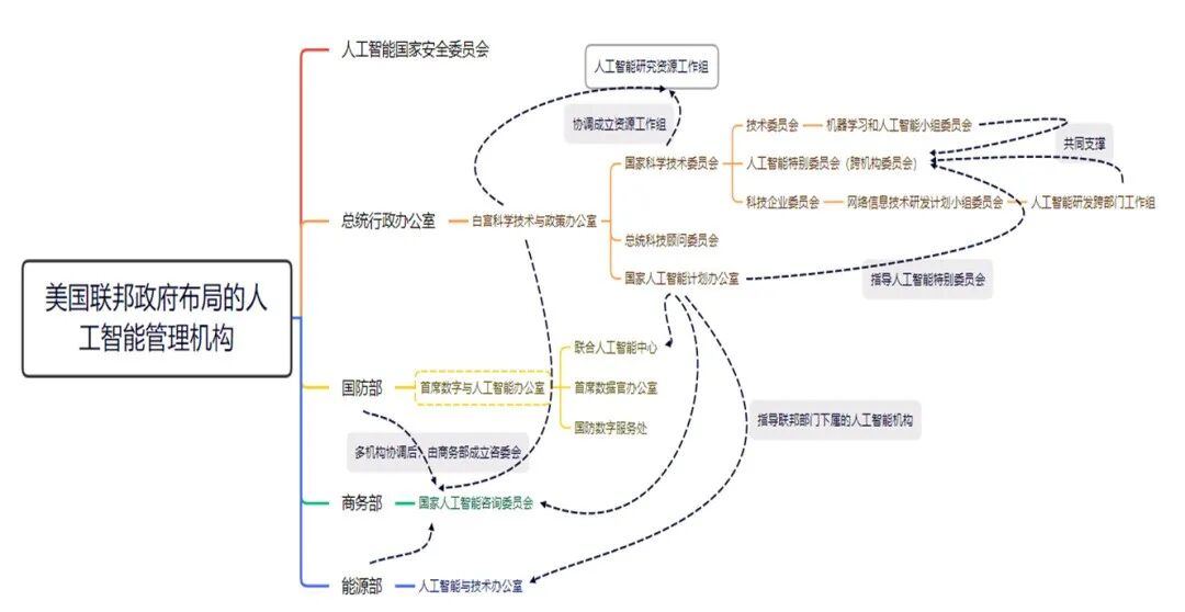 美国在联邦政府层面和所属机构层面分别实施了多项机构增设和调整的改革,力图破除人工智能发展的体制机制障碍,推动机构内外的人工智能研发协作。美国政府人工智能管理机构布局如图3所示。