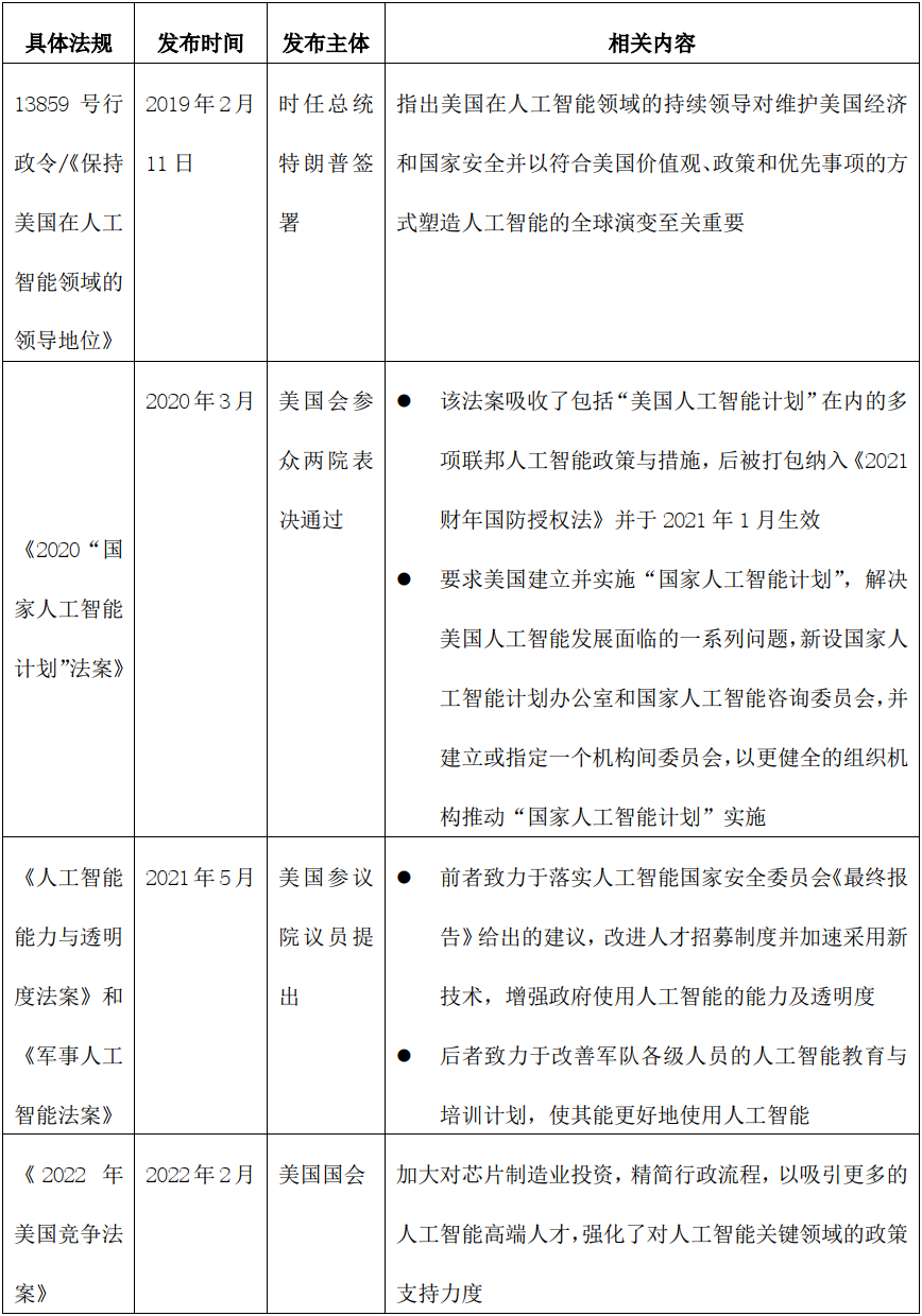 为确保人工智能领域的全球领导地位,美国近几年在行政条令和立法层面进行了诸多尝试,为美国发布的一系列战略规划提供了坚实的制度保障。表2所示为近年来美国军事智能相关法规及内容。