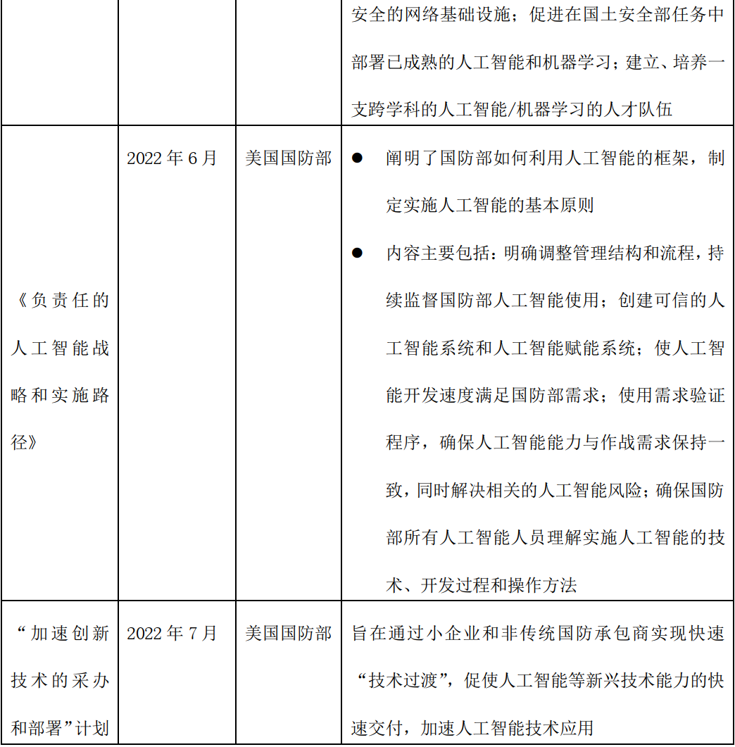 此外,美国国防部还设立了其他人工智能相关机构。2022年5月,美国国防部政策副部长办公室下设新兴能力政策办公室,负责制定与人工智能、高超声速等新兴技术相关的政策,旨在将新兴技术能力整合到国防战略、规划指南和预算流程中,以加速新兴技术开发与作战应用。2022年7月,美国国防部宣布将“机载目标识别与管理”小组更名为“全域异常解决办公室”,并扩大其职责范围,包括同步整个国防部及联邦部门和机构的工作,以探测、识别和确定军事设施、作战区、训练区、特殊用途空域和其他相关区域内或附近的相关目标,消除对国家安全的相关威胁,进一步提升人工智能在整个国防部的重要性。