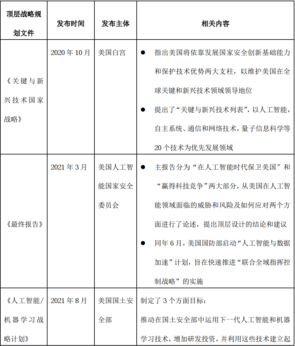 美国从2016年以来出台了一系列人工智能战略与政策,并补充出台了无人系统、新兴技术等相关配套政策,在全球人工智能领域加强战略布局和顶层规划,美国人工智能顶层战略发布时间轴如图2所示。
