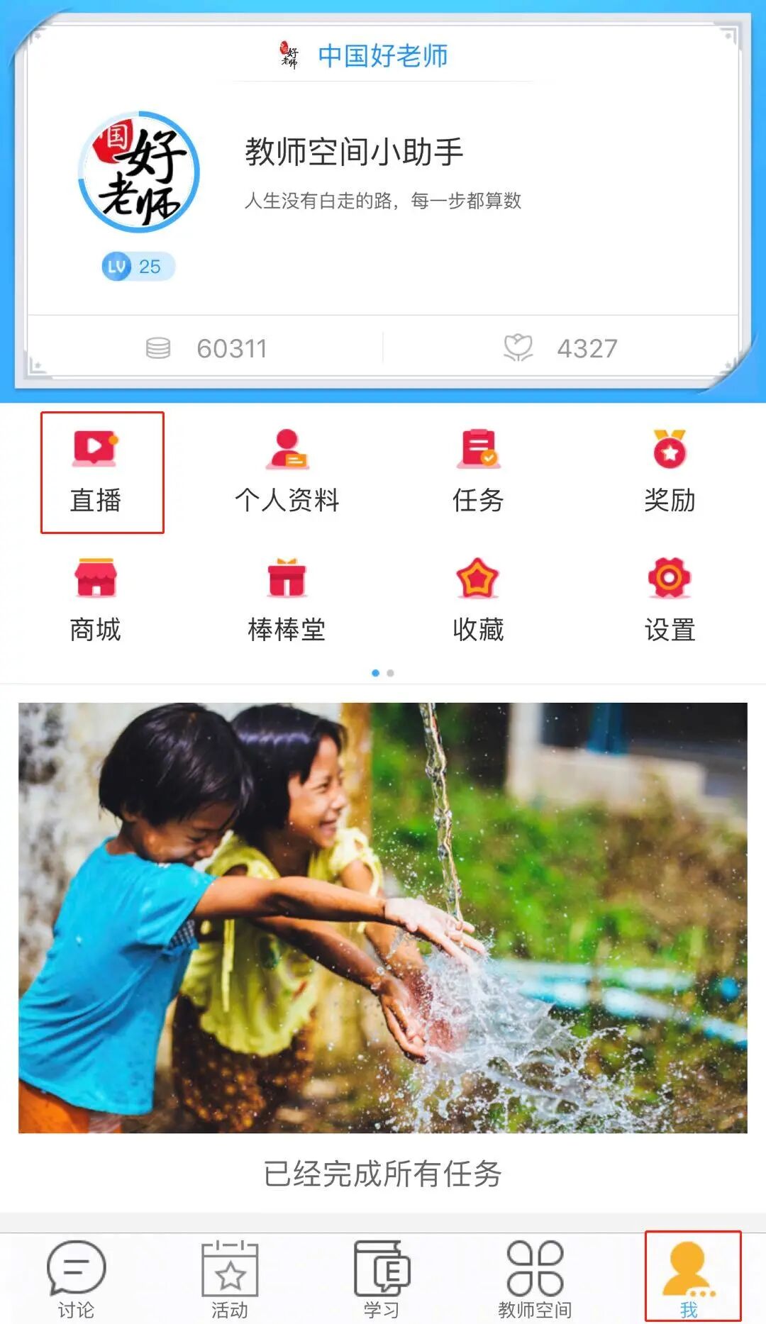 1、打开“中国好老师”App,在【我】-【直播】版块观看。