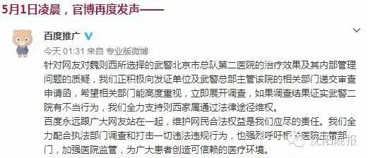 “网友魏则西同学与滑膜肉瘤持续抗争两年后不幸离世,引发很多朋友的关注和哀悼。得知此事后,我们立即与则西爸爸取得联系,致以慰问和哀悼,愿则西安息!对于则西生前通过电视媒体报道和百度搜索选择的武警北京总队第二医院,我们第一时间进行了搜索结果审查,该医院是一家公立三甲医院,资质齐全。网络信息健康有效,是每个互联网参与者的责任。我们愿继续努力,接受监督,不给虚假信息和违法行为留下任何可趁之机!”