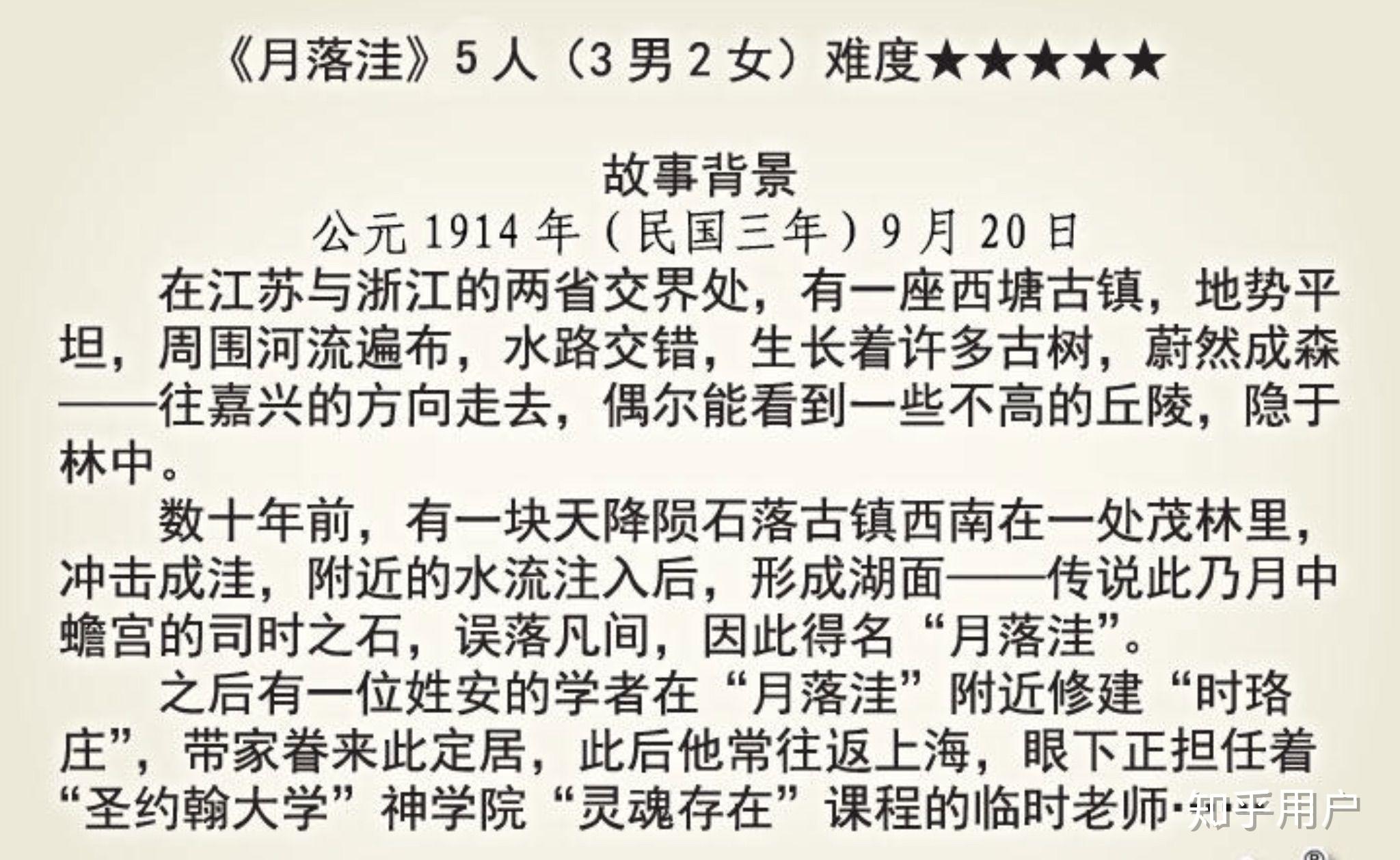 老槐树:6人本需要组织者。需要大量故事推理,让喜欢推理的人大喊过瘾!细心的玩家们很容易推出凶手,作为谋杀推理本来说难度不高,但脑洞方面的推理就很精彩了。虽然我认为设定里面还是存在不少bug,但是总体来说是一个高质量的本,值得一玩哦!