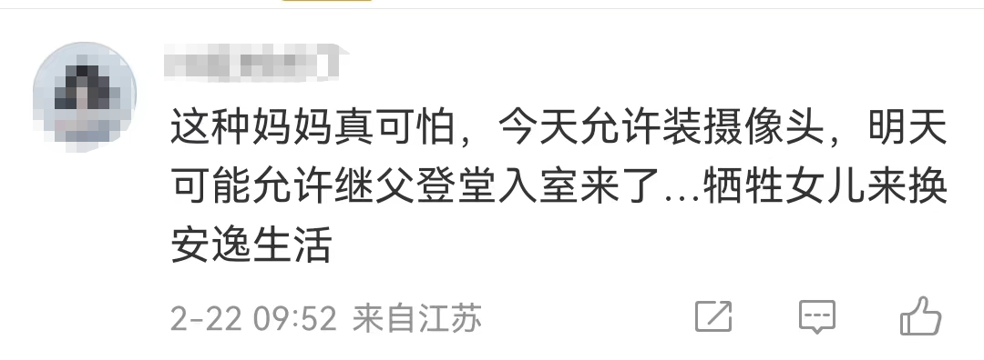 不但没有负罪感,反而责怪女儿“不懂事”。这种母亲,当得起“母亲”这个词吗?更有甚者,抛开情感因素不谈,从法理层面来说,继父也不值得包庇。他安装摄像头的行为,已触及对未成年人隐私的侵犯,严重者可能涉及违法行为。但没想到,就是这样一个无耻的人,竟然让母亲如此费心地维护,连自己的亲生女儿都不管?这才是女孩最心寒的地方。女孩子的悲惨遭遇一经曝光,就引起了全网的热议。许多人对继父的无耻和母亲的懦弱感到愤怒。