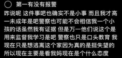 对网民最关心的“是否报警”问题,女孩说:没有报警,只想逃离这个家。