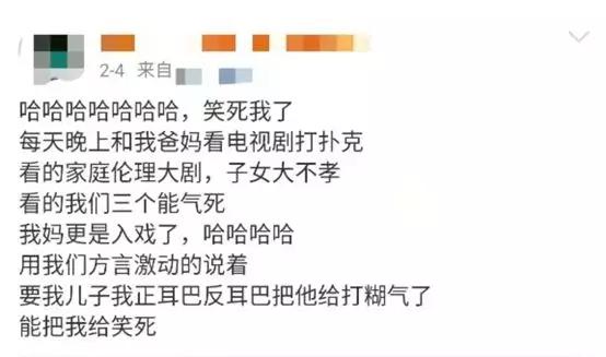 曾批评我们吃饭时不许看电视的他们,端着饭碗坐到了沙发上,对剧情的发展牵牵挂挂:“咋样?演到哪了?人救出来了吗?”看电视时真情实感、被剧中人物气到拍桌的老妈,和看小甜剧时捧脸姨母笑时的我们也没什么区别。