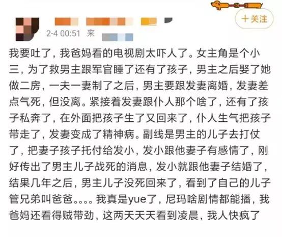 这些作品让人上头的原因只有一个:狗血。足够狗血,就代表这剧情足够跌宕起伏、足够出乎意料,乃至出乎常理。而夸张的剧情会比理性克制的剧情具备更强烈的情绪带动能力,不论它调动起你的愤怒还是震惊,都会让观众催生“看完”的念头,想要给奇怪剧情讨个解释,或是为备受压迫的主人公讨个交代。最后的结果就是:你上头了。 03“别急着帮爸妈换电视剧人家都没管你看的网络小说呢”在今年这个过于漫长的宅家假期中,大家集中围观了爸妈们的看剧品味之后产生的第一个急迫诉求,就是给他们推荐“好看”的电视剧。