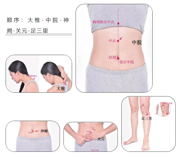 【注:神阙、中脘、关元、足三里孕妇、经期不能艾灸】