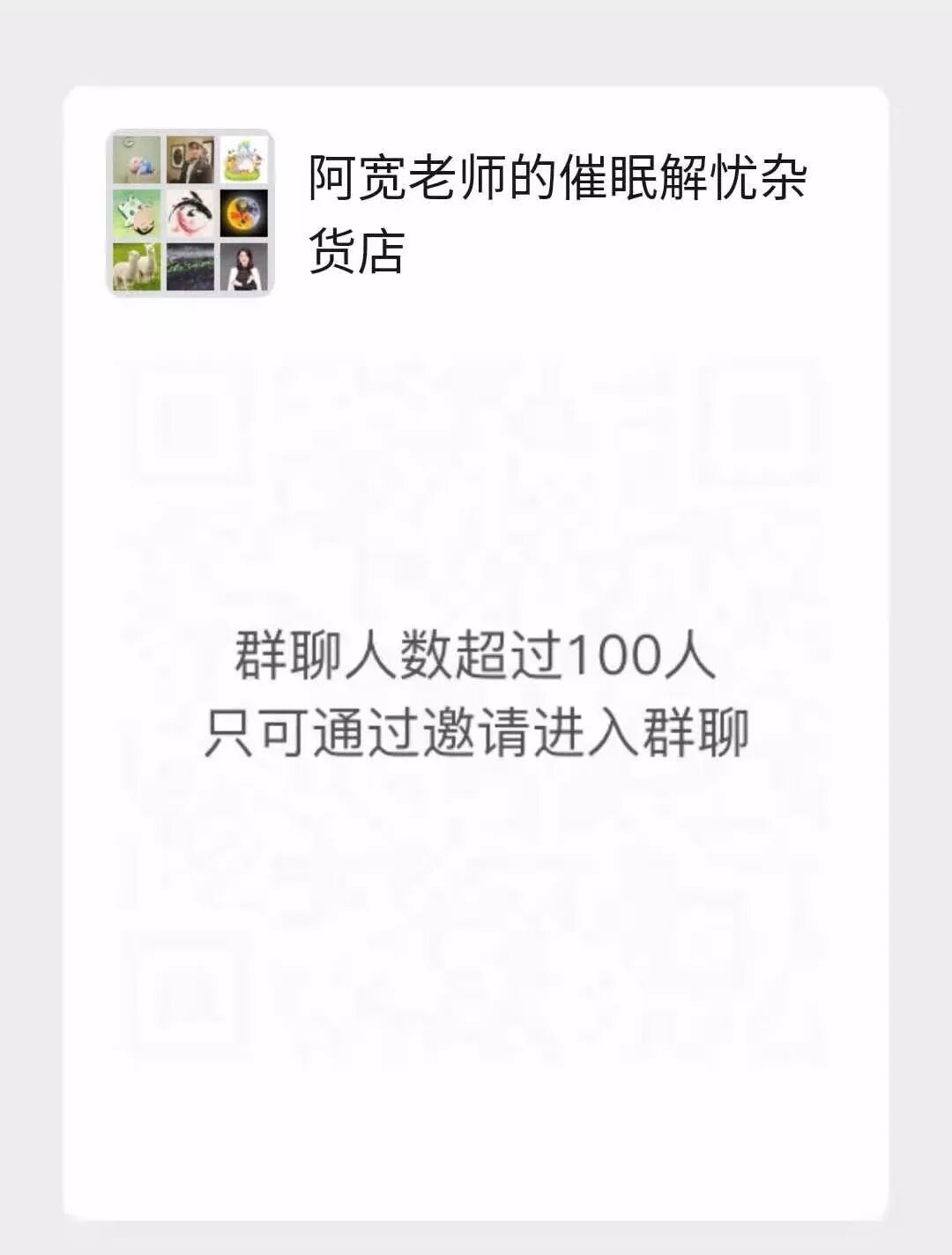 欢迎加入“阿宽老师的催眠解忧杂货店”(这群是干啥的?!)我们在这里等你~由于群内人数过百,无法自行扫码入群了,感兴趣的朋友可加下方助手入群~(若您只是想进群发广告的