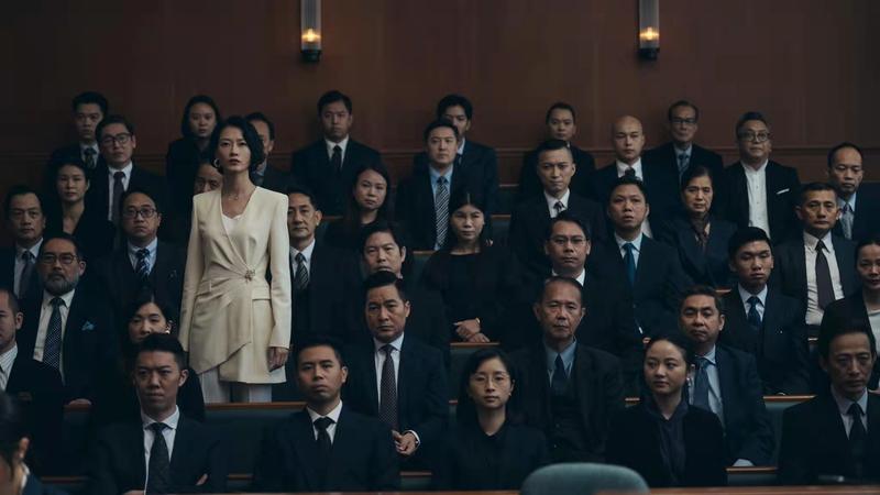 《毒舌律师》剧照。 钟家名媛(白衣者)通过权势请来众多律师来法庭现场助阵。
