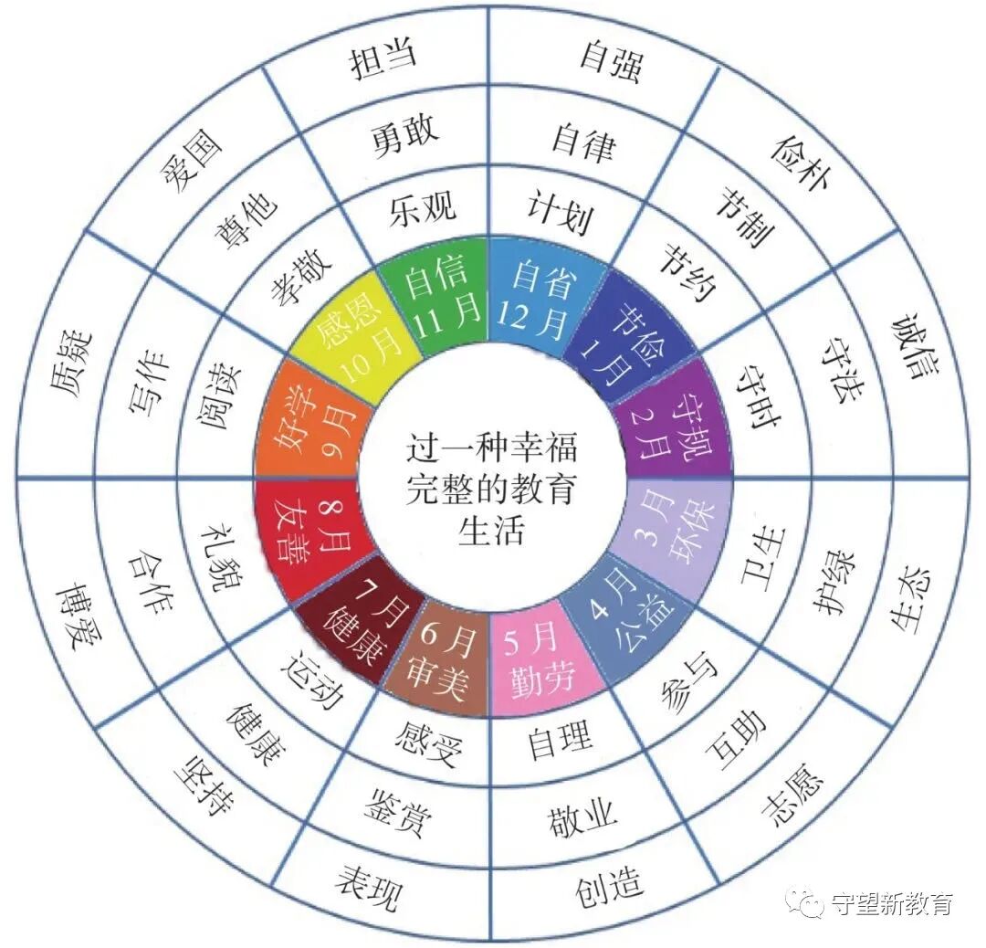 (六)建设数码社区“建设数码社区”,就是指通过加强学校内外网络资源的整合,建设学习型的网络社区,引导师生利用网络进行学习和交流,培养其信息意识和信息应用能力。新教育实验之所以要提出“建设数码社区”的行动,是因为我们清晰地认识到,信息技术革命是新教育的“助产婆”,是新教育得以实现的桥梁和通道。新教育共同体以新教育实验学校为基地,以教育在线为网络平台,通过加强各类数字化学习资源的整合和应用,建设家庭、学校、社区一体化的“数码社区”进行网络学习、交流,在实际应用和操作中提高收集、加工和应用各类信息的能力,促进人的全面发展。 在新教育实验诞生之初,“建设数码社区”就是我们提出的五大行动之一。因为网络的平等性和开放性,打破了传统教育资源垄断的局面,在这样的背景下,谁拥有了网络,谁就能够拥有信息,谁就能成为教育的主人。所以无论是从现代社会的发展,还是从教育自身的发展来看,无论是从新教育实验的发展,还是从建设新教育共同体的发展来说,都需要加快建设数码社区的步伐。数码社区的“社区”概念是超越校园的,着力建设新教育的网络共同体,可以帮助更多的农村和边远地区学校健康发展,帮助更多的师生成长。 能不能具有很强的信息意识,能不能判断信息的价值,能不能有强烈的重视信息的敏锐感,是信息变革时代信息获取有效性的重要评判指标。新教育实验“建设数码社区”的一项重要目标,就是培养教师和学生具有强烈而自觉的信息意识。培养师生全面而快速地获取信息、查找信息的能力,加工信息、应用信息解决问题的能力以及主动而和谐的信息交流能力,也是建设数码社区的题中应有之义。 在21世纪初,新教育实验就建立了自己的网站“教育在线”,在传播新教育理念,汇聚一线教师方面发挥了重要作用。为推进数码社区建设,我们倡导建设具有地域特色、学校特点、教师个性特征的资源网,实验学校把自己的资源(如教案学案、备课资料,甚至课堂在线等)上传,进而实现资源共享,通过分享交流可以有效防止学校间的重复开发、重复劳动、重复购买等资源重叠问题。我们还鼓励部分新教育实验学校建立新教育的师生电子档案,建立新教育实验的网络课题管理系统,注重网络道德建设等。2009年,我们正式建立了网络学习共同体“新教育实验网络师范学院”。2016年,我们研发并推出了新教育研究院的APP。 2019年,笔者编写的《未来学校:重新定义教育》一书,在一定意义上就是对网络时代下教育变革与学校发展问题的思考和对建设数码社区行动的总结。在此书中,提出传统的学校概念将被新的学习中心取代,教学(teaching)的概念将变为学习(learning)的概念,教师(teacher)将成为成长伙伴(partner),标准化(standardization)教育将变为定制化和个性化(customization and personalization)教育(朱永新,2019)。为此,我们建议国家要顶层设计,建立真正以学生为中心的教育社区,建立教育的国家标准和国家教育资源库,建立基于互联网的教育考试评价制度,推动真正数码社区的建设。(七)推进每月一事“推进每月一事”,是根据学生的身心发展特点及学校与社会生活的节律,每月开展一个主题活动,通过主题阅读、主题实践、主题展示、主题评价和反思等方式,开展多种形式的活动,从多角度培养学生良好的行为习惯和公民意识。 新教育实验之所以要推出“推进每月一事”的行动,是因为我们主张教给学生一生有用的东西。什么是学生一生有用的东西?无疑就是伴随着他们的良好习惯,包括读书的习惯、思考的习惯、遵守规则的习惯、做事情有计划的习惯、锻炼身体的习惯、感恩的习惯等等。根据心理学习惯养成规律和社会生活节律,新教育通过每月重点培养一个好习惯的方式,在整个中小学阶段螺旋式训练,以帮助学生养成一生受益的习惯,其中包括12个习纲和36个习目专题。如图1所示: 新教育实验的“推进每月一事”项目,具有独特的教育价值取向。“每月一事”的习惯养成,所养成的不是零碎的杂乱的习惯,而是以习惯为路径,明确指向教育生活的幸福完整,明确指向一个人的人格塑造。我们以自我发展、社会交往和文化学习为维度安排12个习纲,不仅直接有利于自然生命的延长,社会生命的拓宽和精神生命的提升,也与国家提出的核心素养结构相呼应。此外,“推进每月一事”也契合了家校生活的节奏和儿童生命的节律,两者也是设计“每月一事”项目的经线和纬线。我们以年为学习周期整体设计每个月的主题,包括了寒假、暑假,让家庭、学校教育有机地形成一个整体。 大量新教育实验学校的实践证明,通过这一习纲清晰、主题鲜明、习目完整、经纬交织而成的“推进每月一事”项目,学生们的节俭、守规、好学等优良习惯在润物无声中悄然养成,感恩、勤劳、友善等高尚人格也在习惯养成中逐步发展,生活在人格发展中幸福完整。