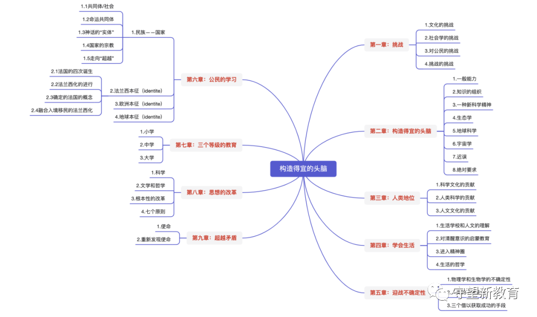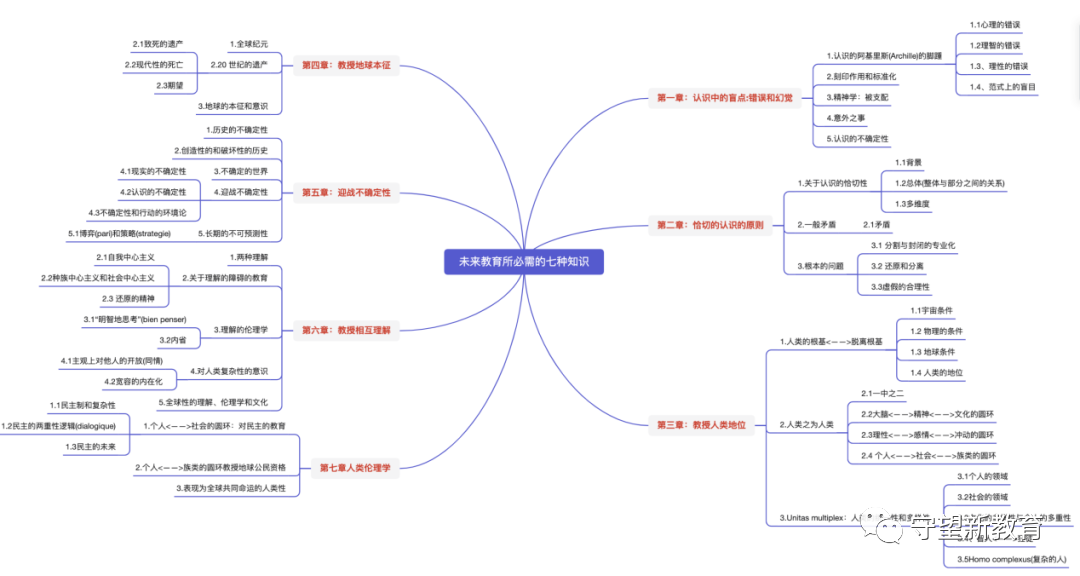 思维导图转自:李书琴 根在课堂4、教授地球本征人类今后的全球性的命运是被教育遗忘的另一个关键的现实。对在21世纪将继续增强的全球化的发展的认识,对于每个人和全体人将日益变得不可避免的对于地球本征的承认,应该成为教育的一个主要题目。适于教授以16世纪所有大陆之间的交往为开端的全球纪元的历史,表明世界的所有部分如何变得相互依存,但并不因此掩饰曾经遍及人类的一部分人压迫和控制另一部分人的事实,这个事实迄今尚未完全消失。必须指示标志着20世纪的全球危机的复杂性,表明全体人类今后面临同样的生死存亡的问题,大家生活在同一命运共同体之中。