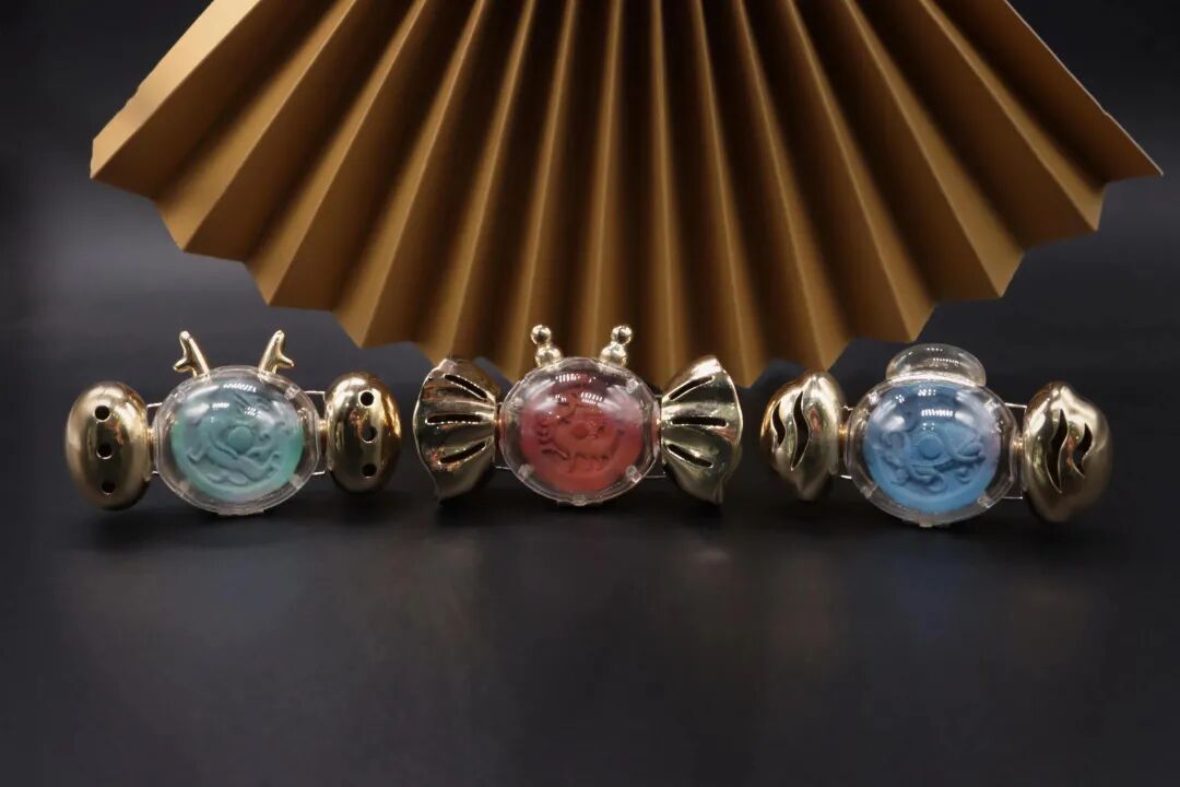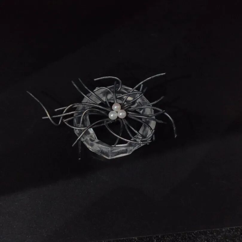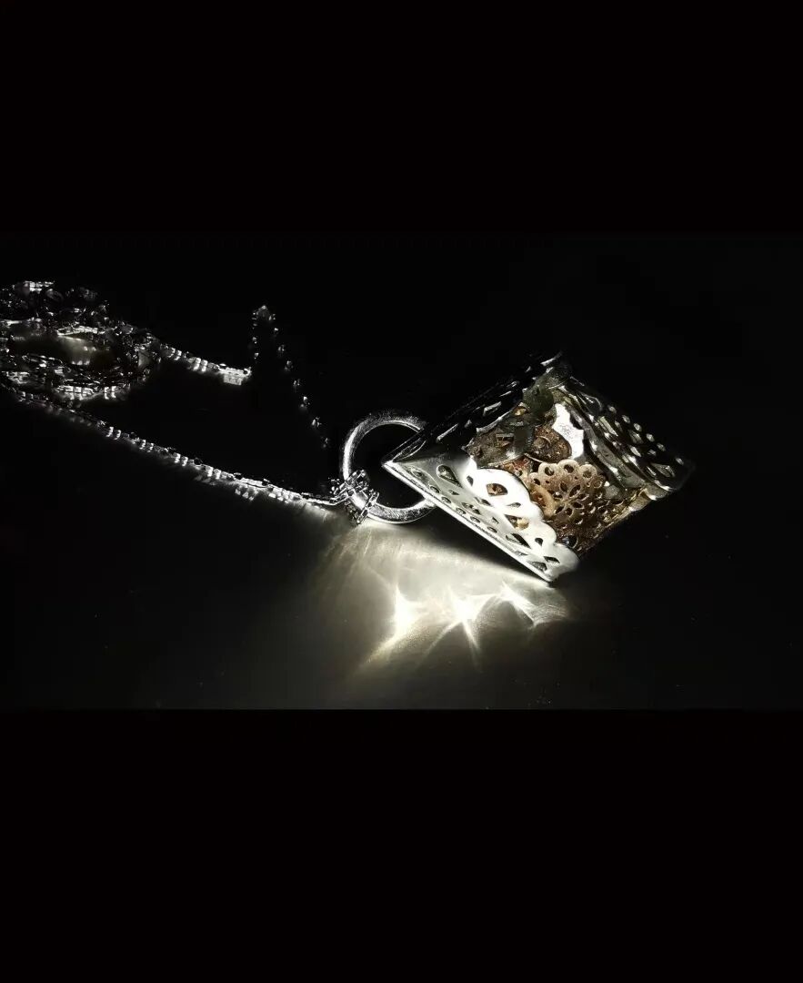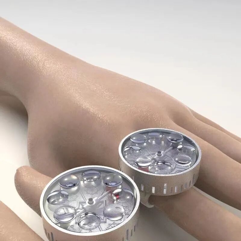 首饰中的指针能够在磁力的作用下呈现出两种不同的状态——吸引与排斥。它的两端在游走的过程中能够被透明树脂上的凹透镜与凸透镜结构反复的进行缩小与放大,转动的速度越快,搏动感越是强烈。