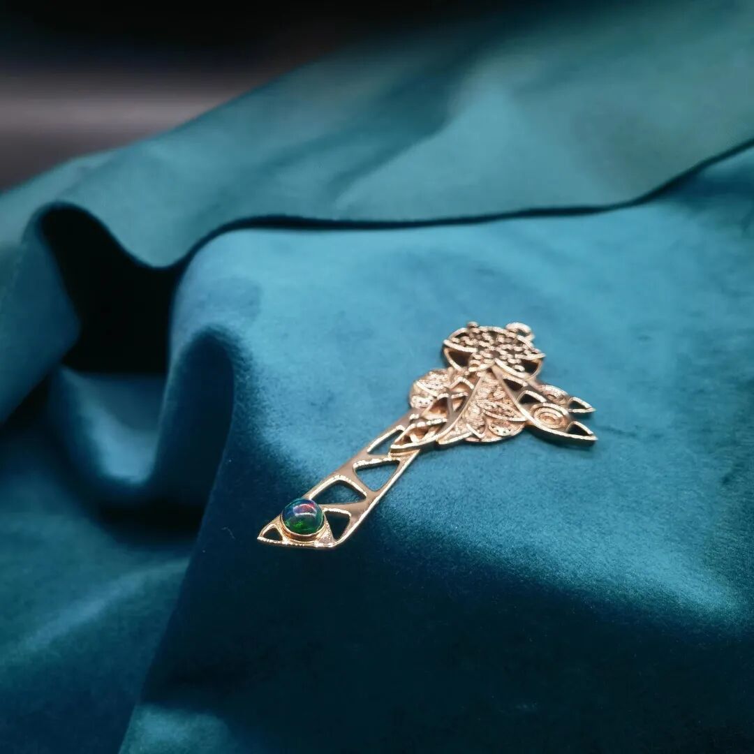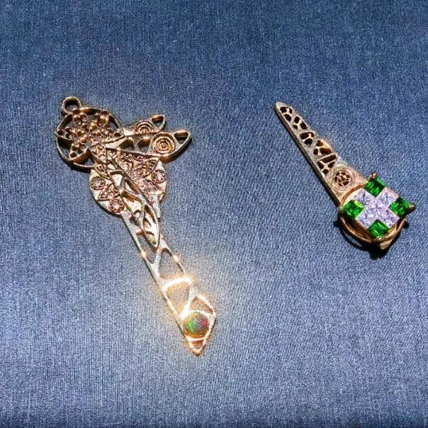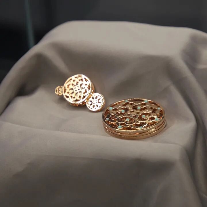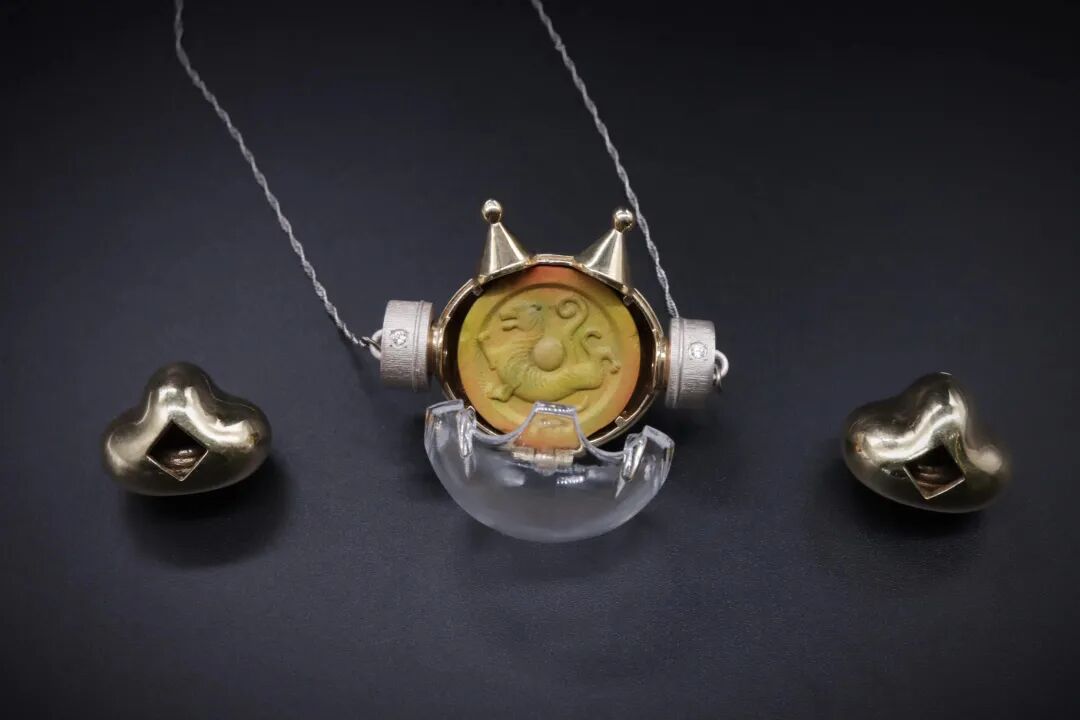 该设计为胸针吊坠两用款首饰,运用螺母结构将三部分连接,盖子是开合结构,增添可玩性。