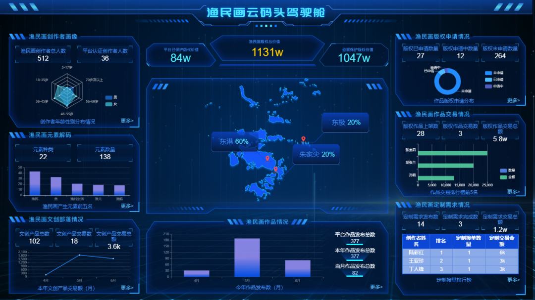 政府数字治理从依靠人工数据统计向在线数据支持转变,决策更科学。改革前渔民画作者人数、企业及工作室数量、渔民画作品、文创产品数量、营业收入等数据由各部门人工统计。改革后业务主管部门登录渔民画驾驶舱,即可看到普陀渔民画的实时在线数据,实现总体运行情况一览无余、渔民画原创作者概况一图即知、渔民画作品版权交易情况一屏掌控、预约交易动态一目了然、用户操作概况一图即得。