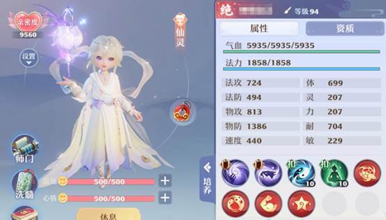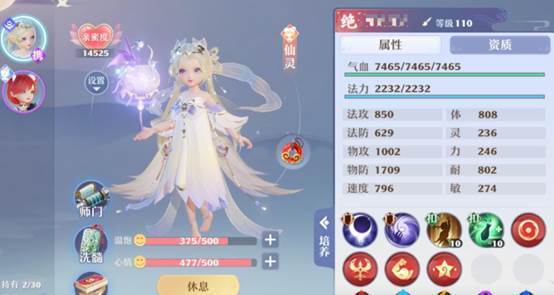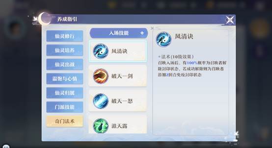 然后是平安扣可以洗入场技能“风清诀”,为召唤者解除封印并施加2回合免疫封印状态,非常泛用且强势的技能,当然如果是想培养一个救人仙灵,可以用“回天息”。再搭配一个离场技能“生生不息”离场回血。至于其他4个技能就很简单了,健壮、护灵/吉星、重生、迅捷。