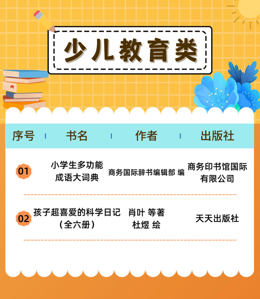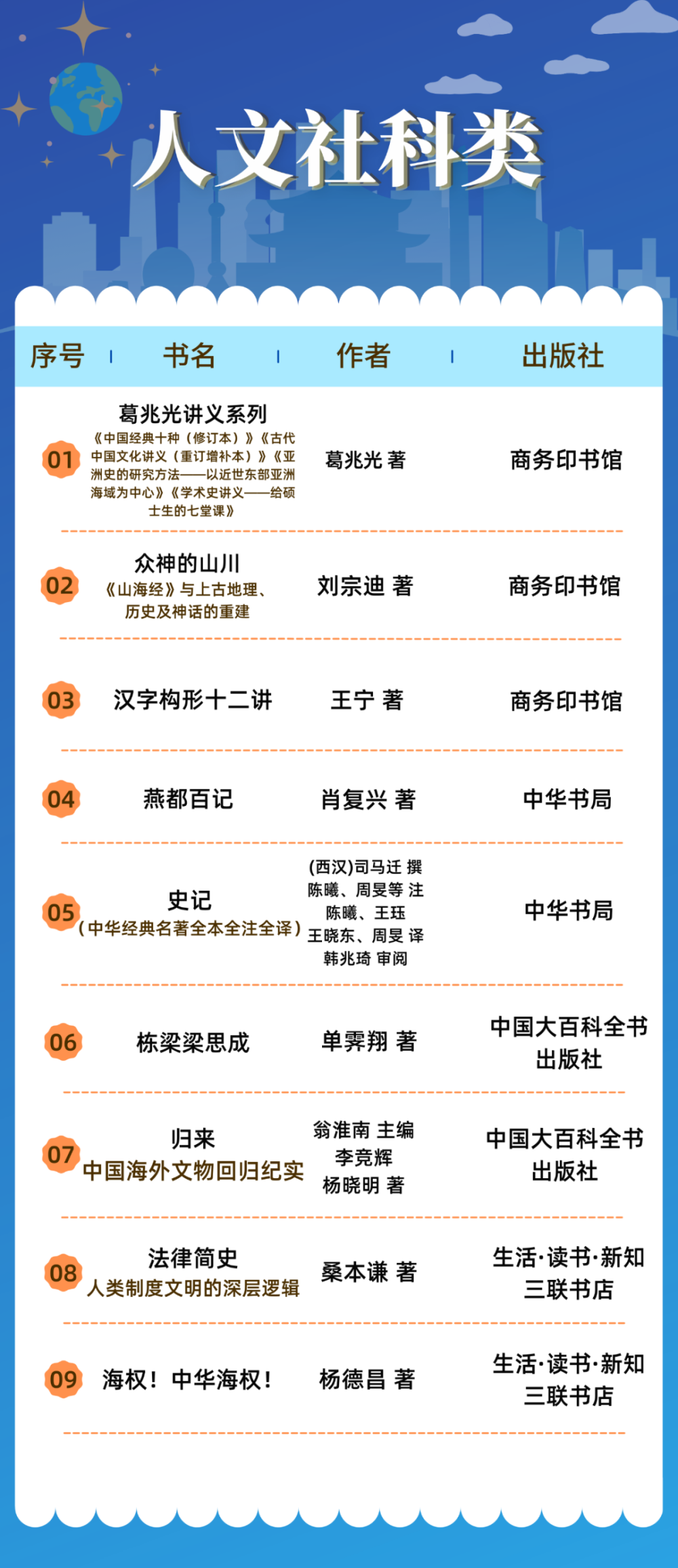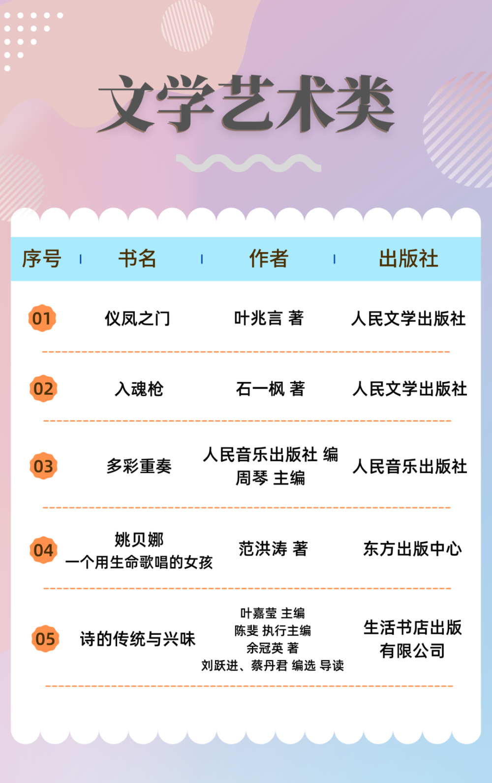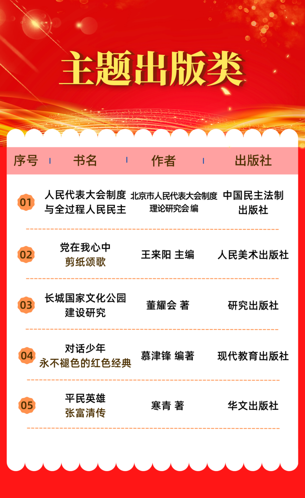 本期榜单精选主题出版、人文社科、文学艺术、科技经管、少儿教育五大类共23种好书。