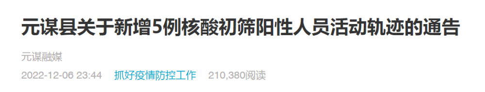 2022年12月5日,元谋县新增6例核酸检测初筛阳性人员,均已闭环转运至定点医疗机构诊治,现将有关情况通告如下: