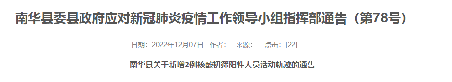 南华县关于新增2例核酸初筛阳性人员活动轨迹的通告