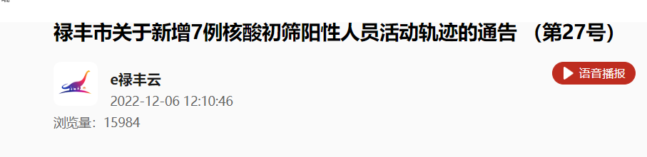 2022年12月5日,禄丰市在临时管控区域和重点筛查人群中发现7例核酸初筛阳性人员,均已闭环隔离转运至定点医疗机构。现将有关情况通告如下:
