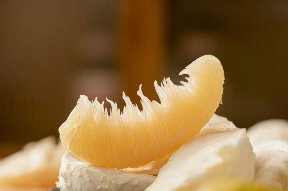 拾起一瓣,放入口里,轻轻一咬,脆嫩的果粒“嘣,嘣”爆在口中,但不似琯溪蜜柚那般直接飙出汁水。