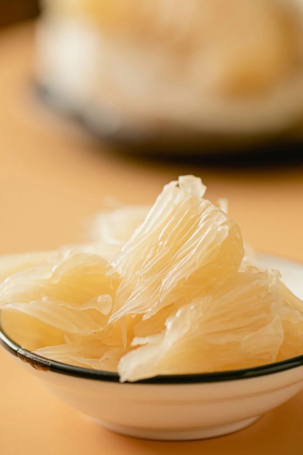将皮剥去后,金柚的肉瓣,质地坚挺,好似是用冰糖酿出来的一般;满满的果肉放在碗中/柚皮中,果肉晶莹剔透像水晶,看着就十分喜人~