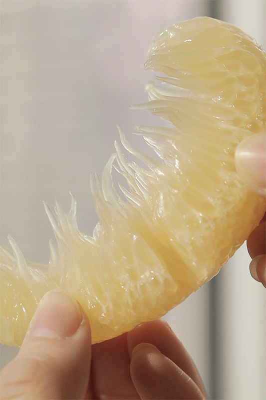 沙田柚的甜,是有些“内敛”的,需要细细品味;唇齿咀嚼间,甜蜜的味道在嘴里,慢慢地绽放开来,越嚼越甜;咽下后,仍有如花蜜般特别的清香留在口中,令人回味~