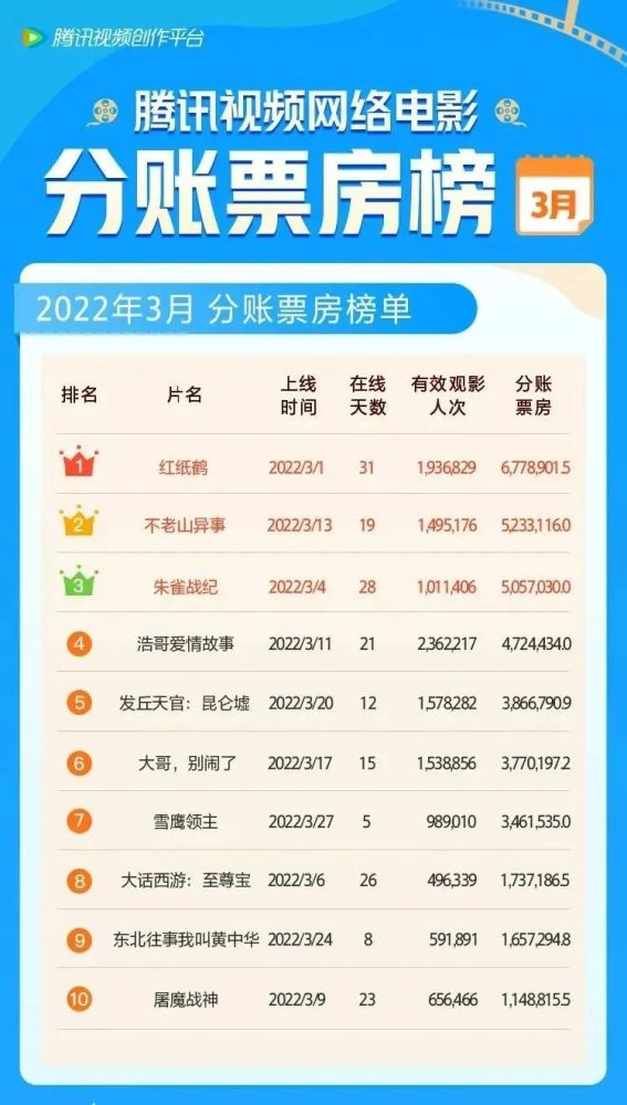 手机访问:wap.265xx.com3月腾讯视频网络电影分账票房TOP10一览:3部超500万