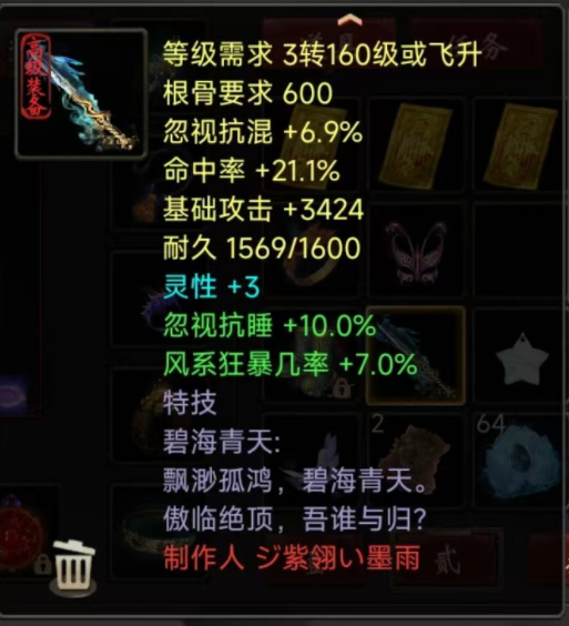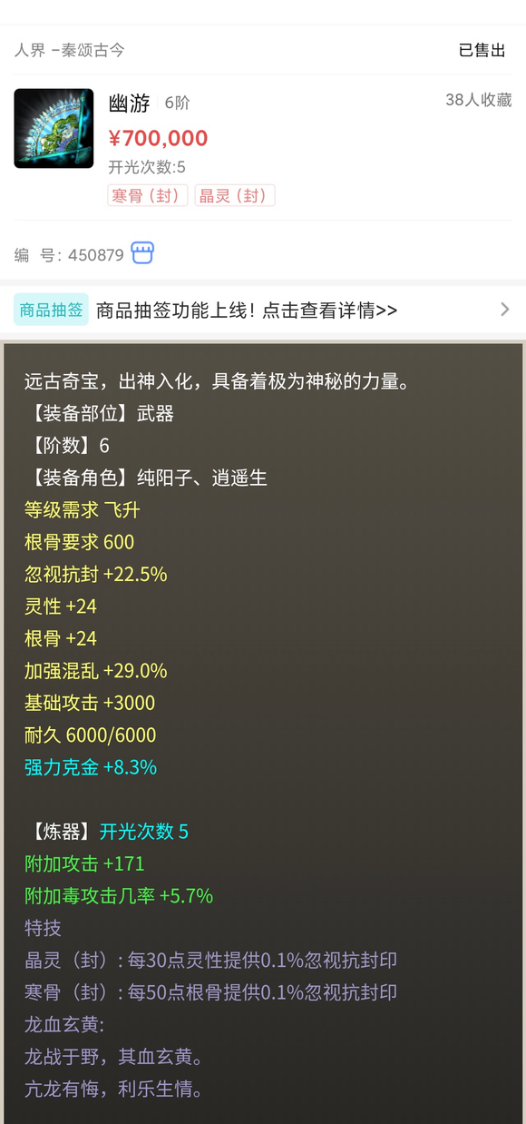 6阶仙器扇子,底了忽视冰22.5,加强混乱29,炼器开光5次,特技晶灵封和寒骨封,最后被70点走。所以说不怕贵,怕的是没有极品属性,现在玩家都在追求极致路线。