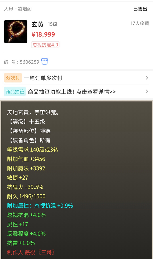 这件链子整体忽视4.9,离最极品差了0.2,结果被1.899点走了。上篇牛图文章发了一件忽视5.1的链子,要28,也是仙法底子,两者只有0.2的属性,居然价值相差快20倍了。如果是人法底子忽视5.1属性,现在要33和46,仙器都差远了,所以说有个好底子是第一步。