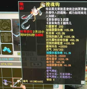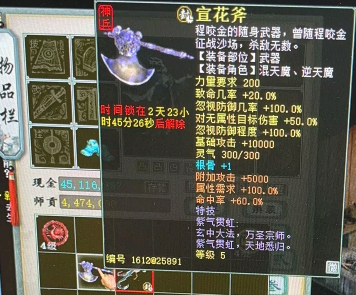 2、接着来看一位老铁冲神兵,就是不知道他一开始是准备了多少个神兵开始砸的,只是见他上了三次电视,第一次和第二次是将一把搜魂钩冲到四级后又冲到五级,第三次是将一把宣花斧冲到了五级,那么这两把五级神兵武器的全貌分别是霹雳反击破搜魂钩和五级致命破宣花斧,看着就十分的给力。