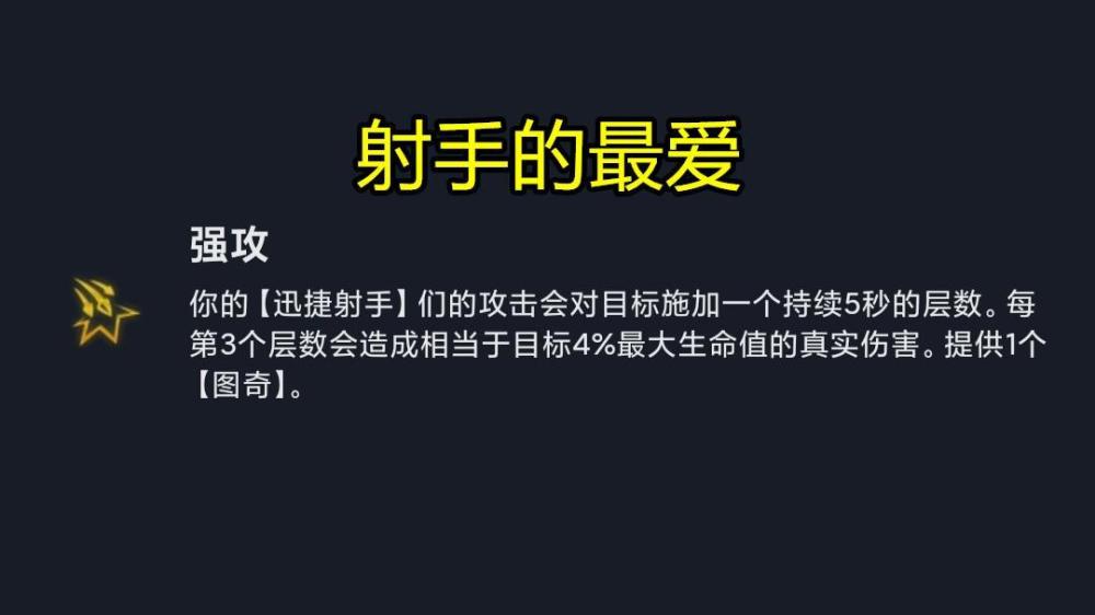 每三次攻击会让射手们对目标造成4%最大生命值的真实伤害,别看数值不高,要知道,迅捷射手叠攻速非常快,拿到这个海克斯至少也要开4射手的,配一把羊刀,后面攻速上3轻而易举。高攻速配合真实伤害,能轻而易举地融化前排,即使是土龙也扛不住这种伤害啊。