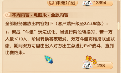 1、帮战斗偃玩法再次优化,如果一方少于10人,则双方斗偃维持联通状态,可以自由进出对方出生点。