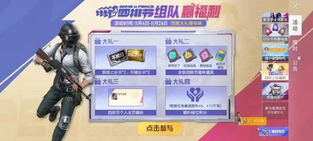 想要上分排位的玩家们,抓住这个机会,在四排节活动期间,只要组队参加游戏,就可以获得四重大礼,如双倍上分卡或者不掉分卡、四排节趣味道具、四排节个人主页装扮、额外段位积分,根据难度任务额外加五到十分不等。想要快速达到王牌,一定要在本月24日前,努力地找战友上分。