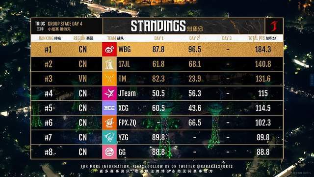 这不,在仅仅的四天比赛中,WBG在三排的表现是非常惊艳的,第二天斩获87.8积分,第四天斩获96.5积分,成绩相当的稳定。最关键的是,WBG的总积分是184.3分,领先第二名将近44分,这是什么概念?相当于是领先其他人两把大分局,晋级小组赛肯定是没有压力了,大概率还是积分榜榜首晋级的!