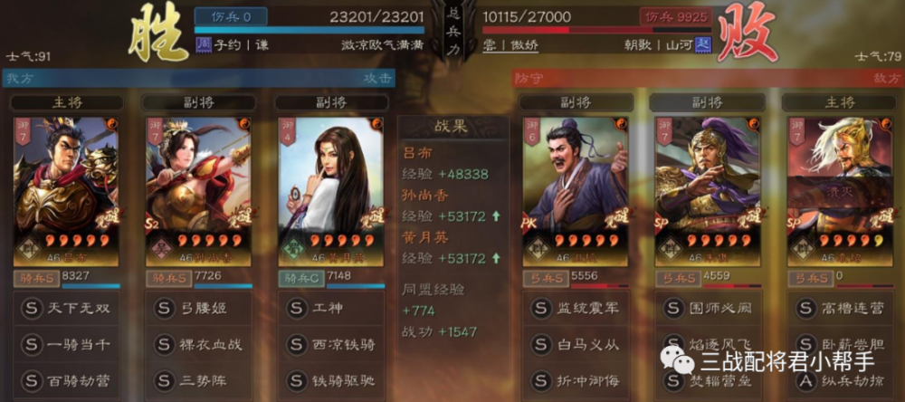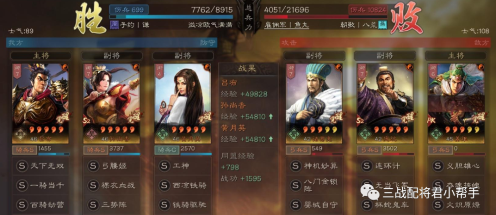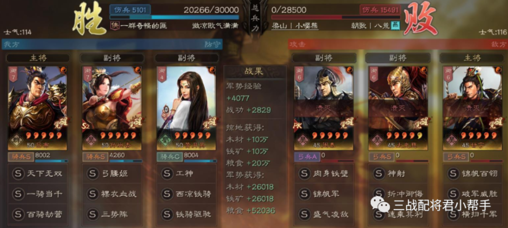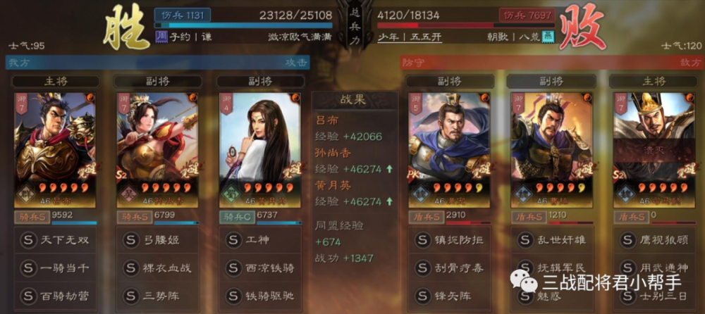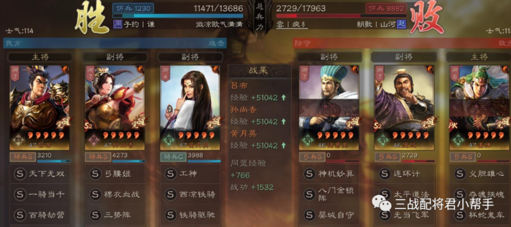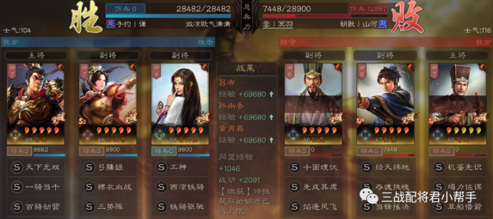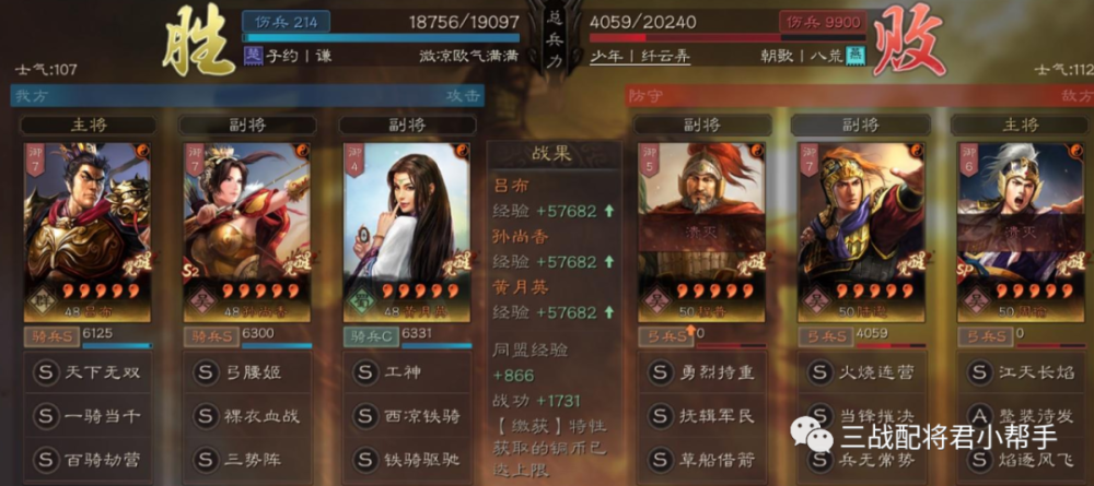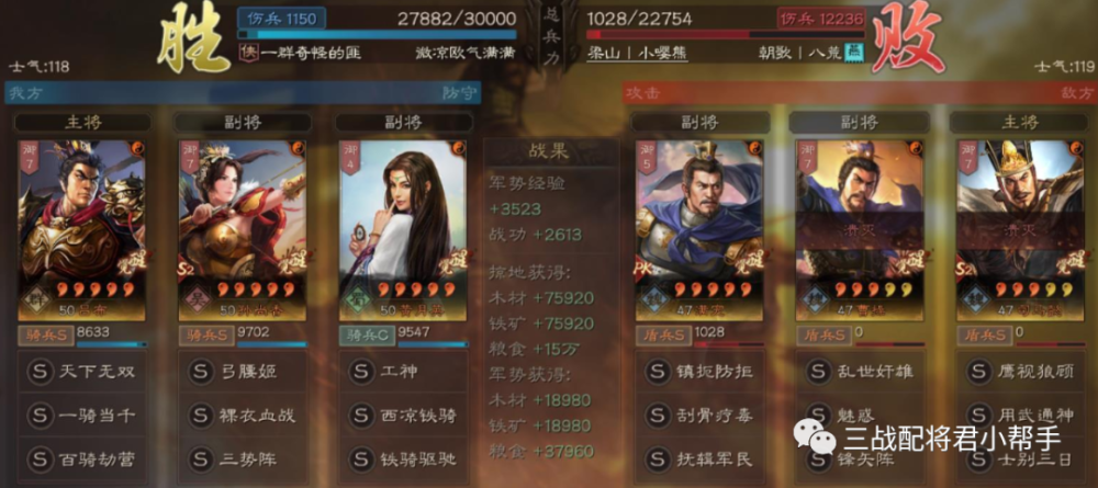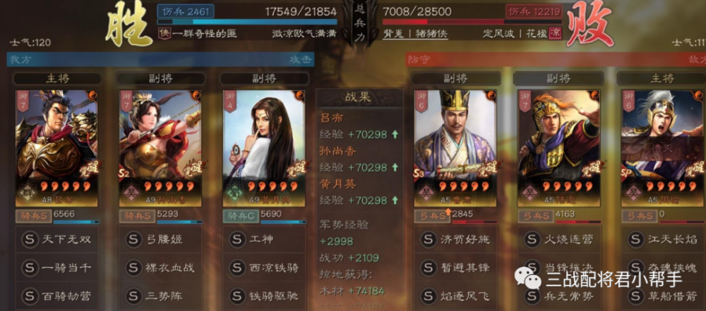 总结:可以看到这个队伍无论是残兵还是满兵打架都很猛,并且经常能打出各种低战损甚至无损秒人的战报,如果取看战报的话,会看到西凉铁骑各种暴击后的亮眼数据,实战多穿强度的话可能比较难打出天下无双的水平,不过打个上万战功却是没有任何问题,也就是说兵力较多的适合当主力来用都是可以的,如果感觉有更猛的队伍,那么兵力拉到1W左右也能玩碰瓷!玩腻了吴骑或者拥有高红孙尚香的玩家可以考虑玩起来了!