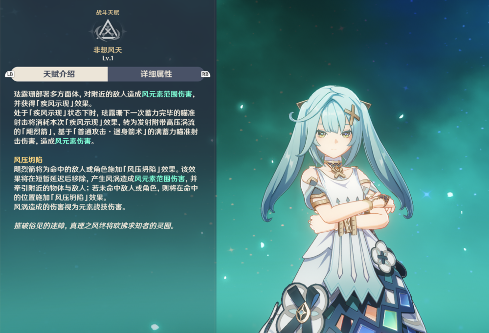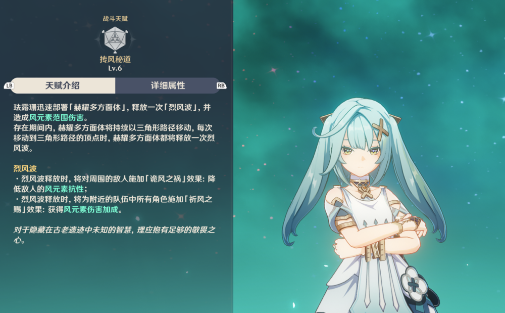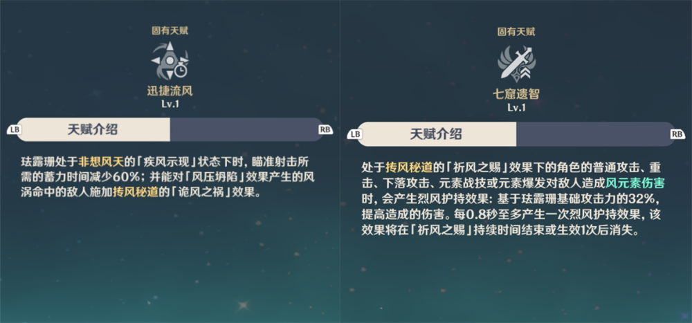 然后是两个战斗天赋,第一个“迅捷流风”在分析元素战技时已经介绍完了,就是减少“飓烈箭”的蓄力时间和给风涡提供减风抗的效果。第二个“七窟遗智”是处于珐露珊大招增伤buff下的角色,普攻、重击、下落攻击、战技或大招造成风伤时,会根据珐露珊基础攻击力的32%提升伤害,最多每0.8秒一次。