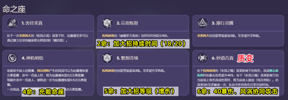 六命是质变命座,大招增伤buff新增提升40%风元素暴伤的效果;另外还有协同前台攻击,3秒最多触发一次的风压坍陷(之后也会触发风涡),对充能、聚怪、伤害都有提升。综合来看,珐露珊的2/4/5/6命都和辅助能力相关,且6命达到完全体,所以命座对于珐露珊来说比较重要。不过这不代表低命不能用,零命的珐露珊就自带减风抗,增风伤和一定的聚怪效果了;能抽到关键命座更好,但抽四命命座也需要量力而行。