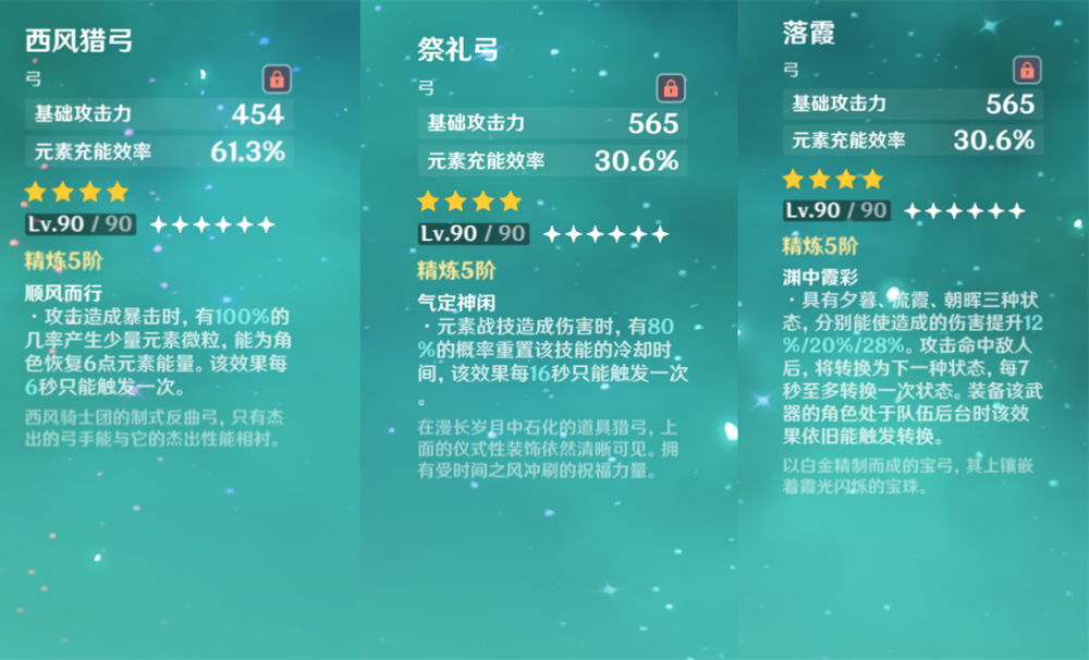 武器推荐优先度:终末嗟叹之诗>西风弓>祭礼弓=落霞。终末弓不必多说,最强辅助弓,特性还能补足珐露珊没有的攻击力区加成。没有终末就带西风弓,注意多堆点暴击保证特性的触发率。祭礼弓其实不太推荐,因为珐露珊战技一轮操作后,最后的风涡命中敌人才会产球,并且两次产球间有内置CD,对特性的瞬间双E不太友好,推荐作为排在终末和西风之后的备用。落霞和祭礼弓优先度差不多,副词条给的充能相同都不算太高,特性更注重伤害而不是辅助。