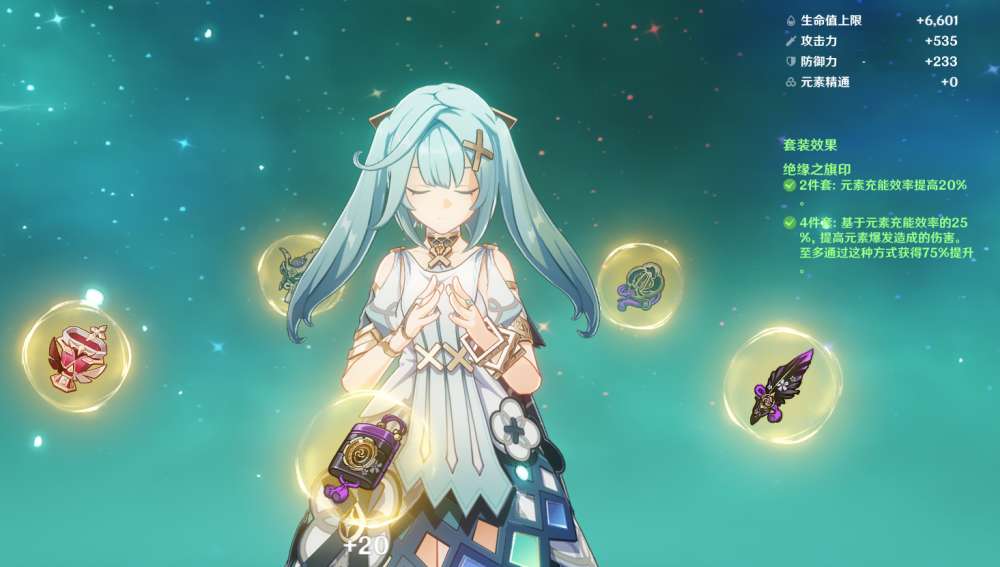 “遇事不决绝缘套”,既然珐露珊需要充能,绝缘套就能派上用场了。如果不在意伤害,圣遗物最低要求只需要2绝缘搭配任意散件(或者2流放者)加充能沙即可。当然个人还是更推荐4绝缘,毕竟珐露珊大招倍率不低。