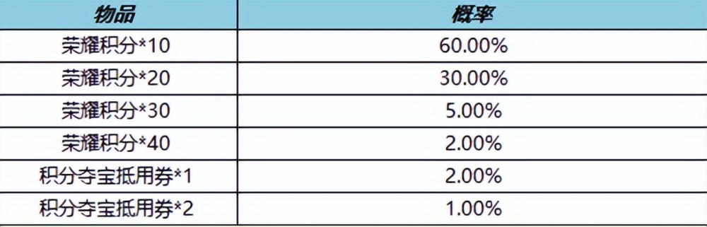 荣耀积分幸运礼上架。上架时间:12月8日更新后-12月14日23:59,礼包中不仅包含10点券,而且还有10/20/30/40荣耀积分和1/2个积分夺宝抵用券,如果想要抽荣耀水晶的话,这个活动可以说是非常划算了,因为如果运气好的话,花10点券我们就可以获得两个积分夺宝抵用券,这样就可以抽取两次了,如果两次直接出荣耀水晶,那就赚翻了,如果额外的奖励只拿到了10荣耀积分,那我们也有10点券保底,这个还是非常划算的。